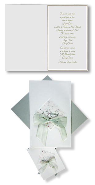 Cream card with gold edge wrapped in sheer green ribbon with rose applique, mounted on willow suede and cream. The name on this invitation is displayed in Large Name format.